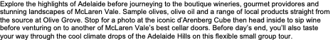 Your day continues on to another of McLaren Vale''s premier cellar doors before venturing into the cool climate of the Adelaide Hills. Here, you will taste your way through an array of breathtaking wineries, sampling some of the most exceptional cool-climate drops in the country.